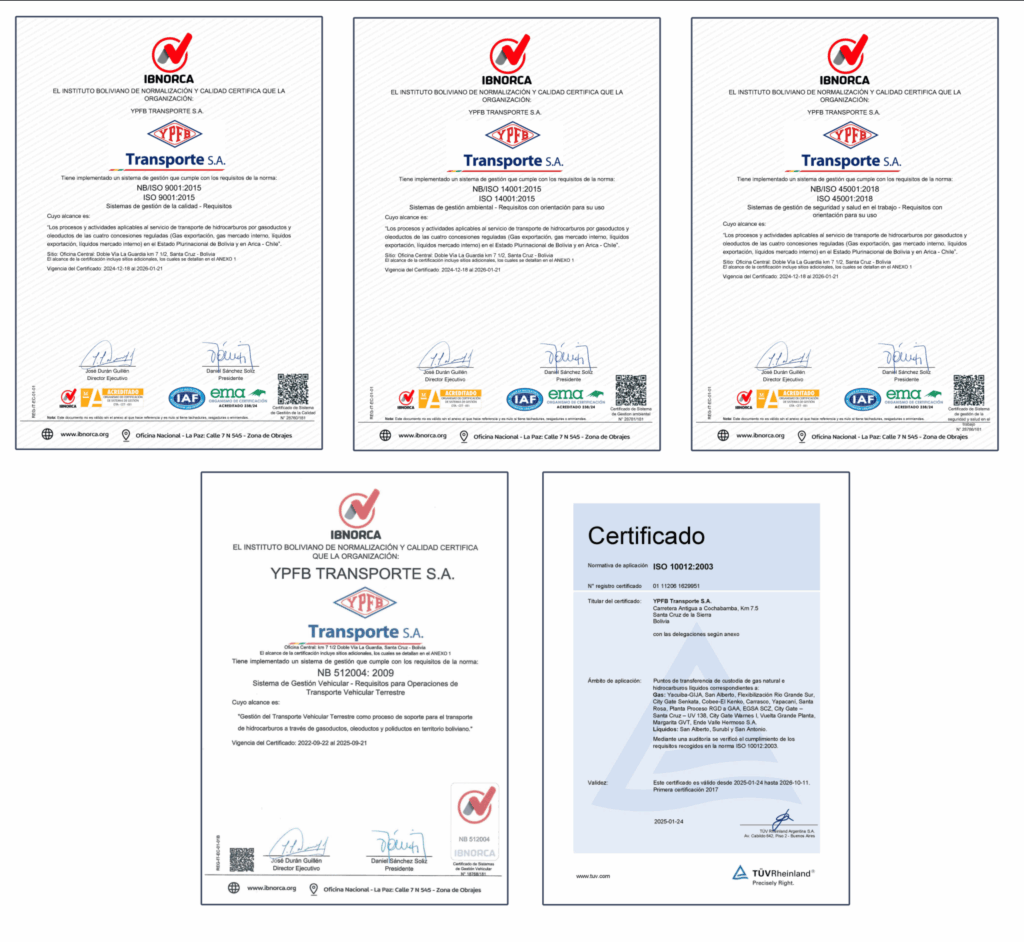 YPFB TRANSPORTE S.A. se ubica como la única empresa del rubro petrolero en Bolivia con un Sistema de Gestión Integrado certificado bajo cinco certificaciones nacionales e internacionales conforme a las Normas: