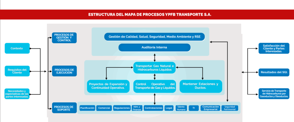 El Sistema de Gestión Integrado ha sido desarrollado por YPFB TRANSPORTE S.A. mediante la implementación de Reglamentos, Procedimiento e Instrucciones de Trabajo que definen las directrices para ejecutar la planificación y ejecución de los procesos/actividades y mejorar su desempeño, proporcionando una base sólida para las iniciativas de desarrollo sostenible.